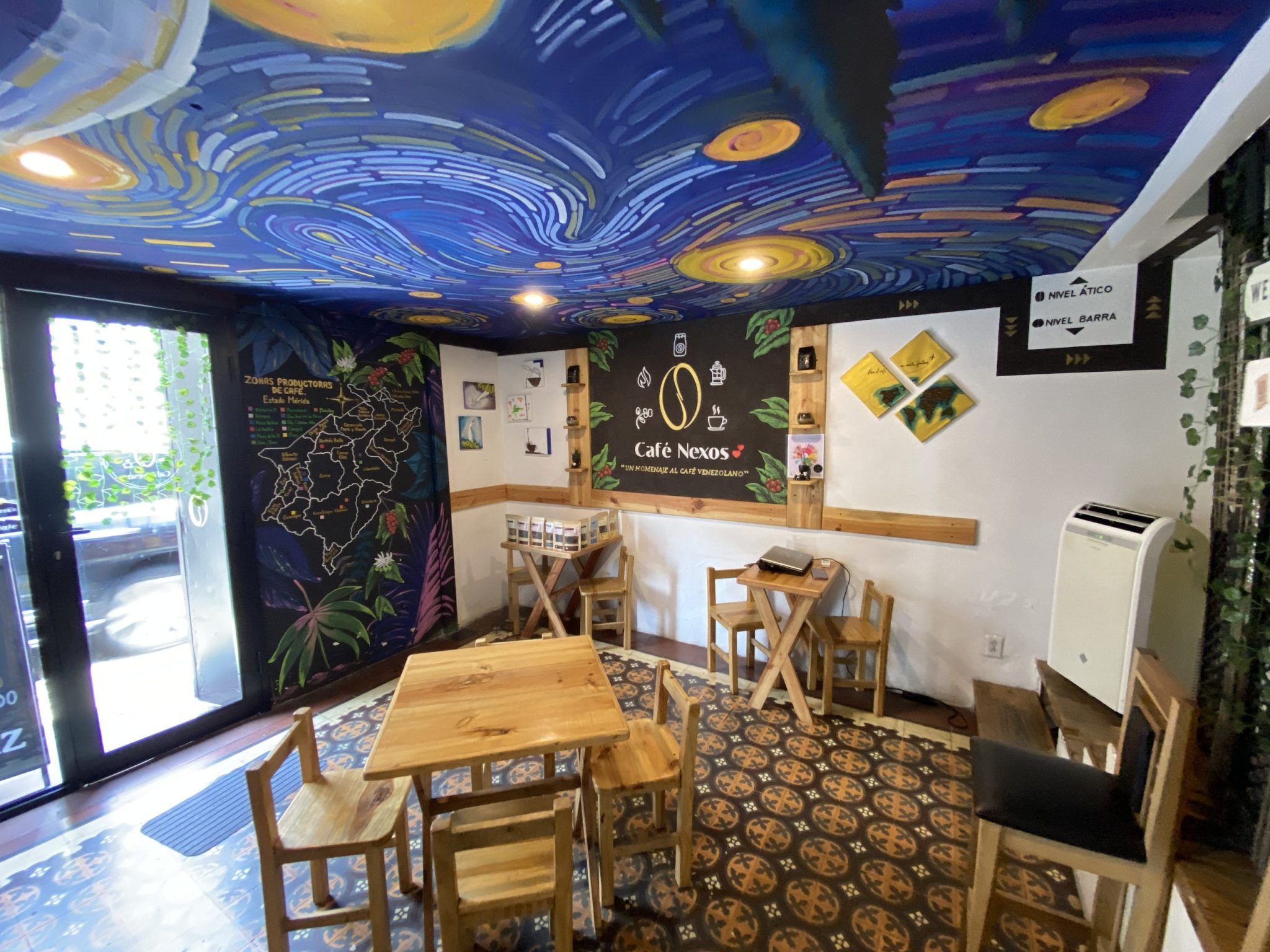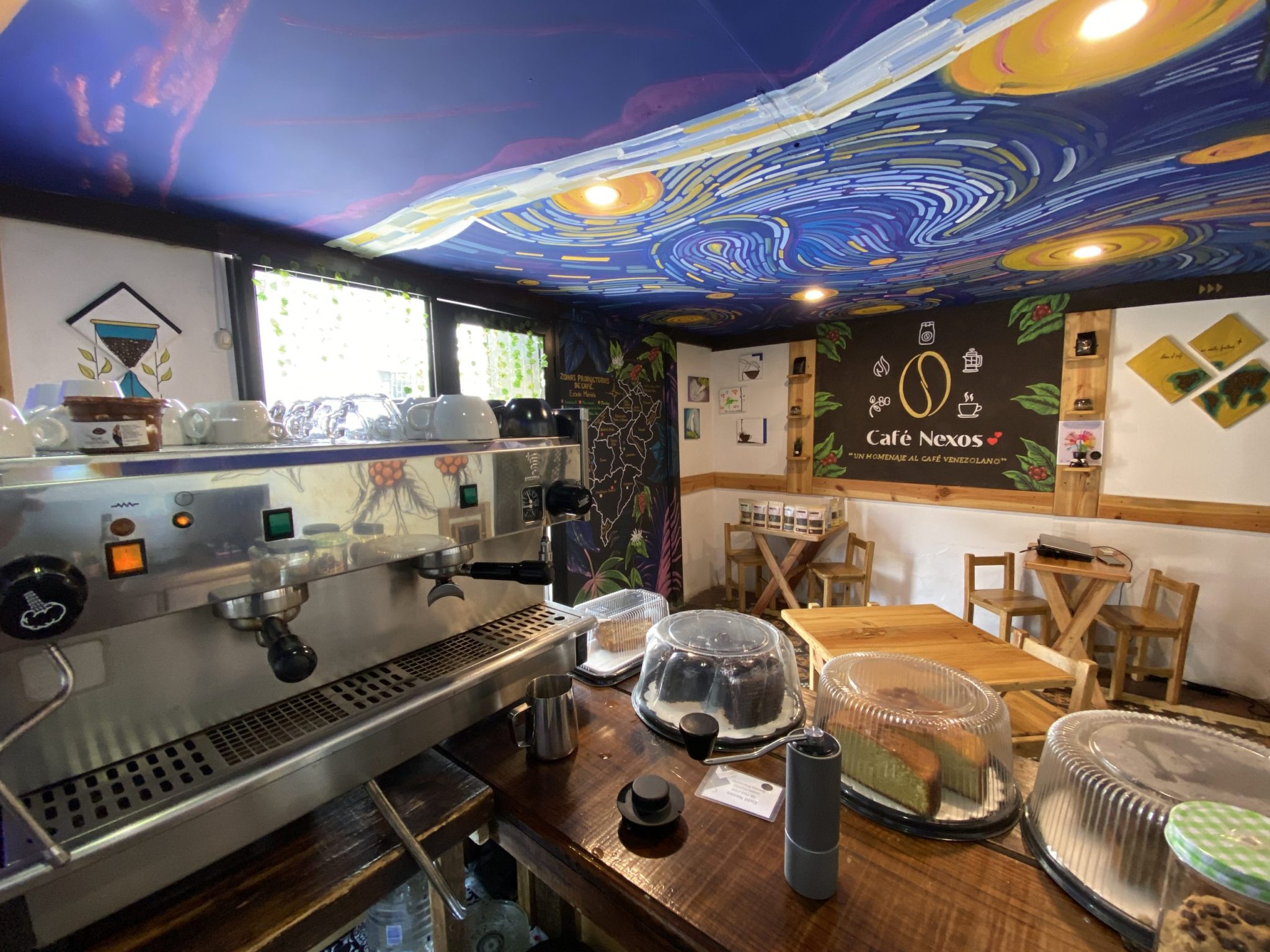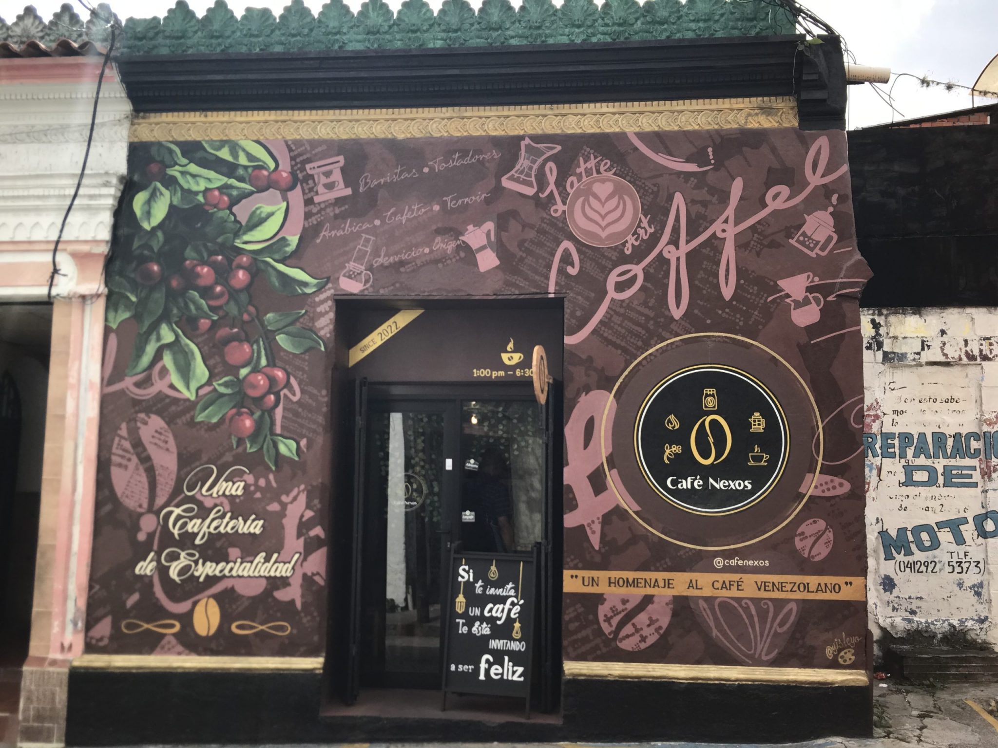 Café Nexos se encuentra en el casco histórico de la ciudad de Mérida, en una hermosa casa colonial de época. Podrás reconocerlo por sus murales y disfrutar de obras de arte desarrolladas por artistas escultores locales, lo que genera un ambiente y un culto hacia el café de nuestra región y el café venezolano.